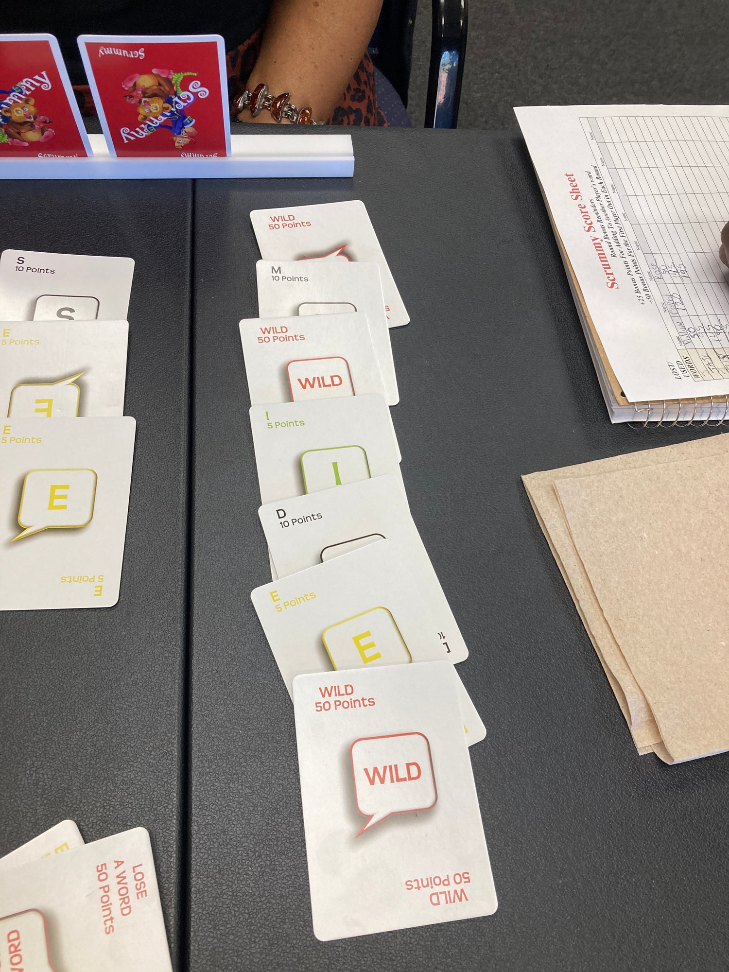 We cannot wait to see what happens at Your Scrummy table. Check out this play; it shows how the possibilities in Scrummy games are endless. See how M(a)IDE(n) MAIDEN, became (m)EDI(u)M(s) MEDIUMS, by adding the WILD card at the top, changing the existing WILD cards and spelling in the opposite direction. AWESOME Scrummy move!